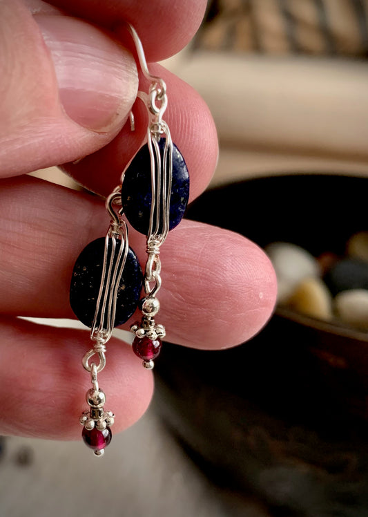 Consolación Earrings - Lapis Lazuli and Garnet with Silver Wrap Detail