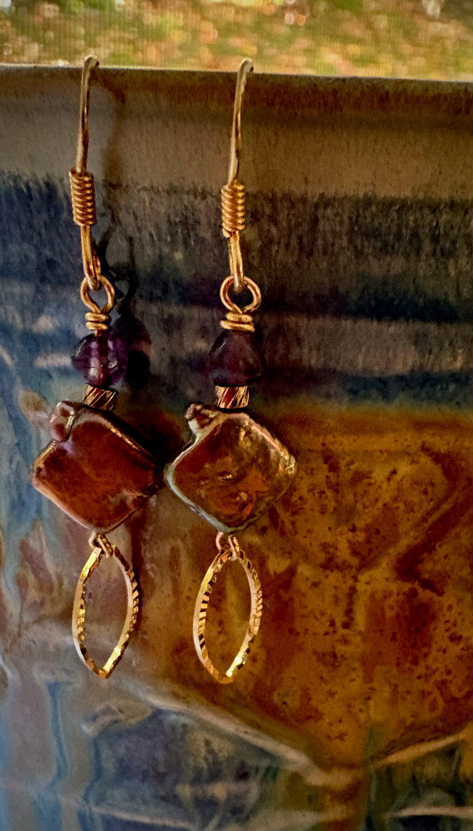 Elegant but quirky shaped freshwater copper pearls and fluorite stones complemented by gold-plated dangles and French hook ear wires.