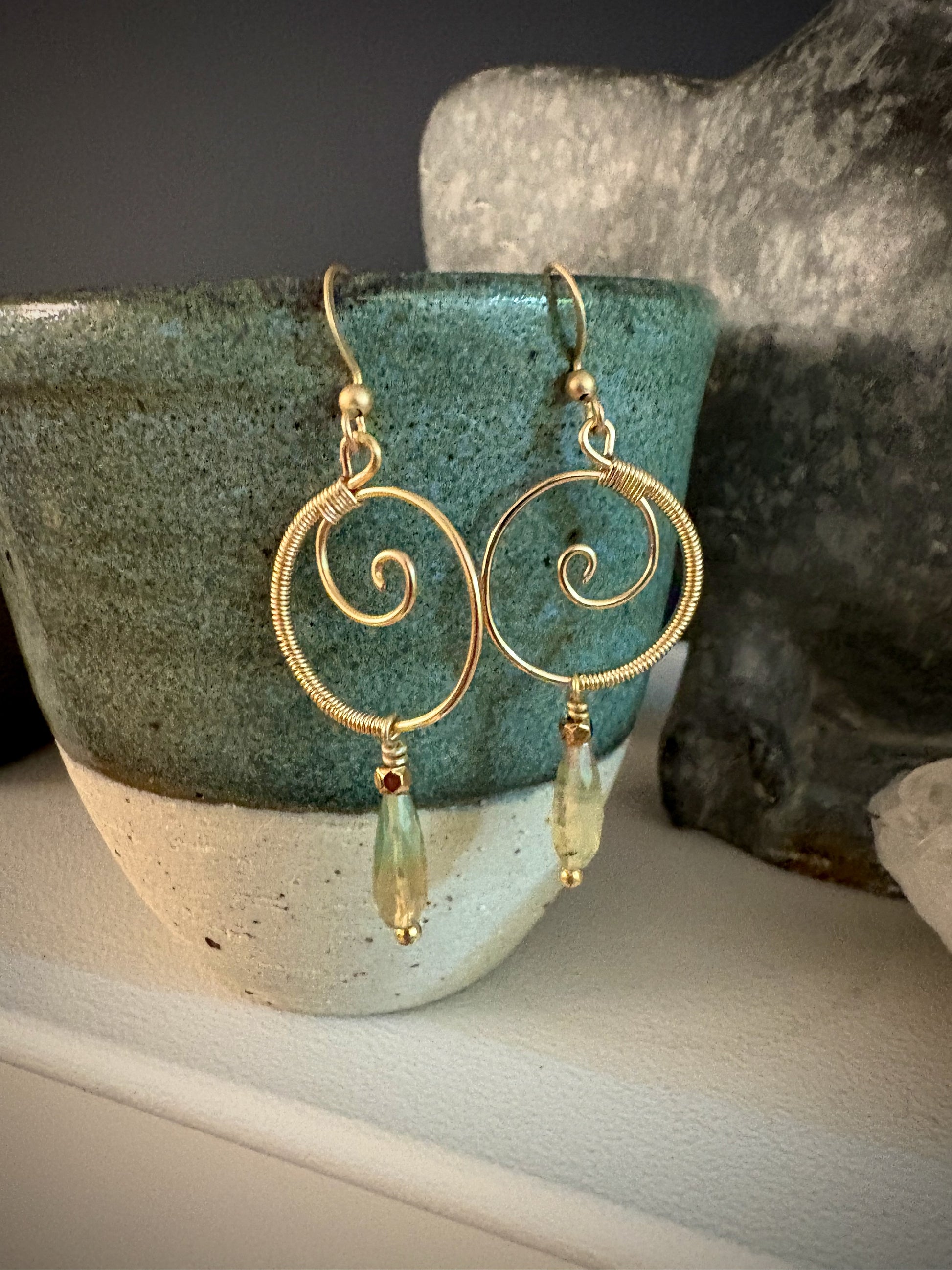 Elegant Favorecida Earrings featuring fluorite stones, intricately wire-wrapped and suspended from gold-plated French ear wires.