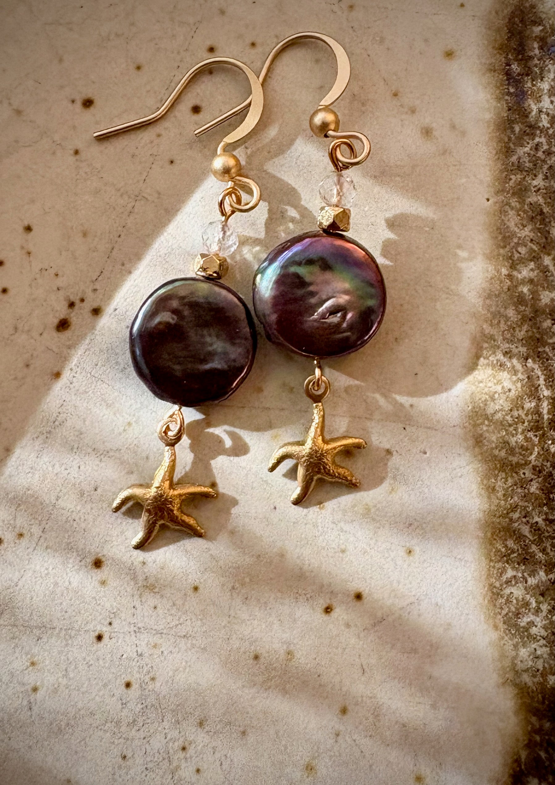Our Jazmín Earrings feature iridescent peacock pearls and quartz. Suspended from gold-plated French hooks, each pair is adorned with delicate starfish dangles that add whimsy and character.