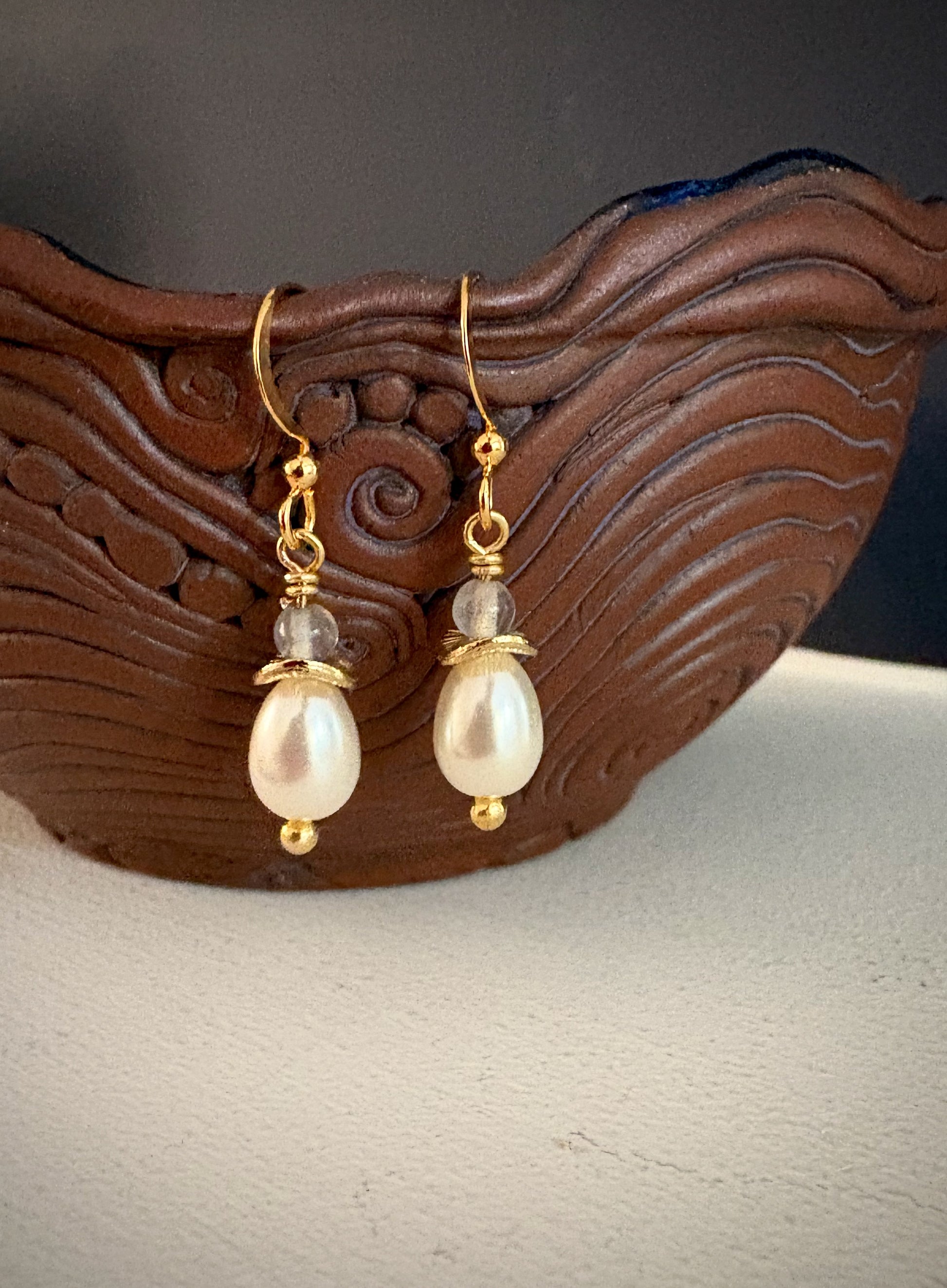 The Lisa Earrings feature freshwater pearls and labradorite stones, elegantly set on gold-plated French hooks for a refined and timeless look.