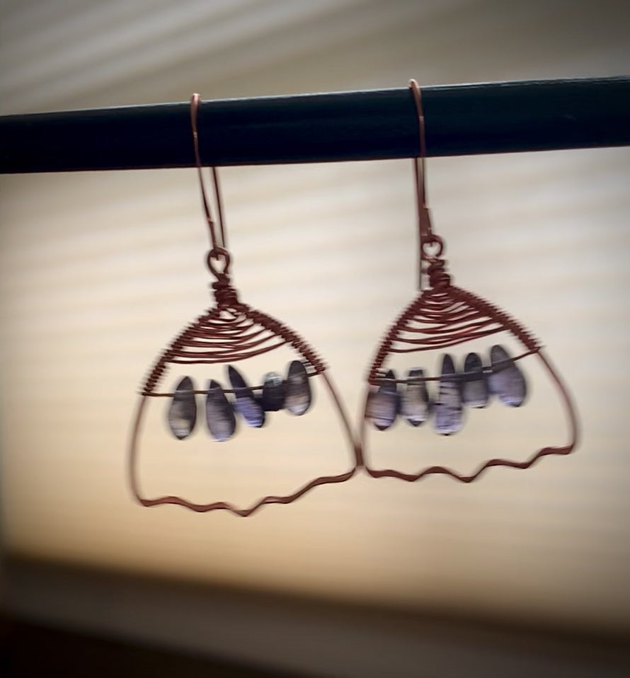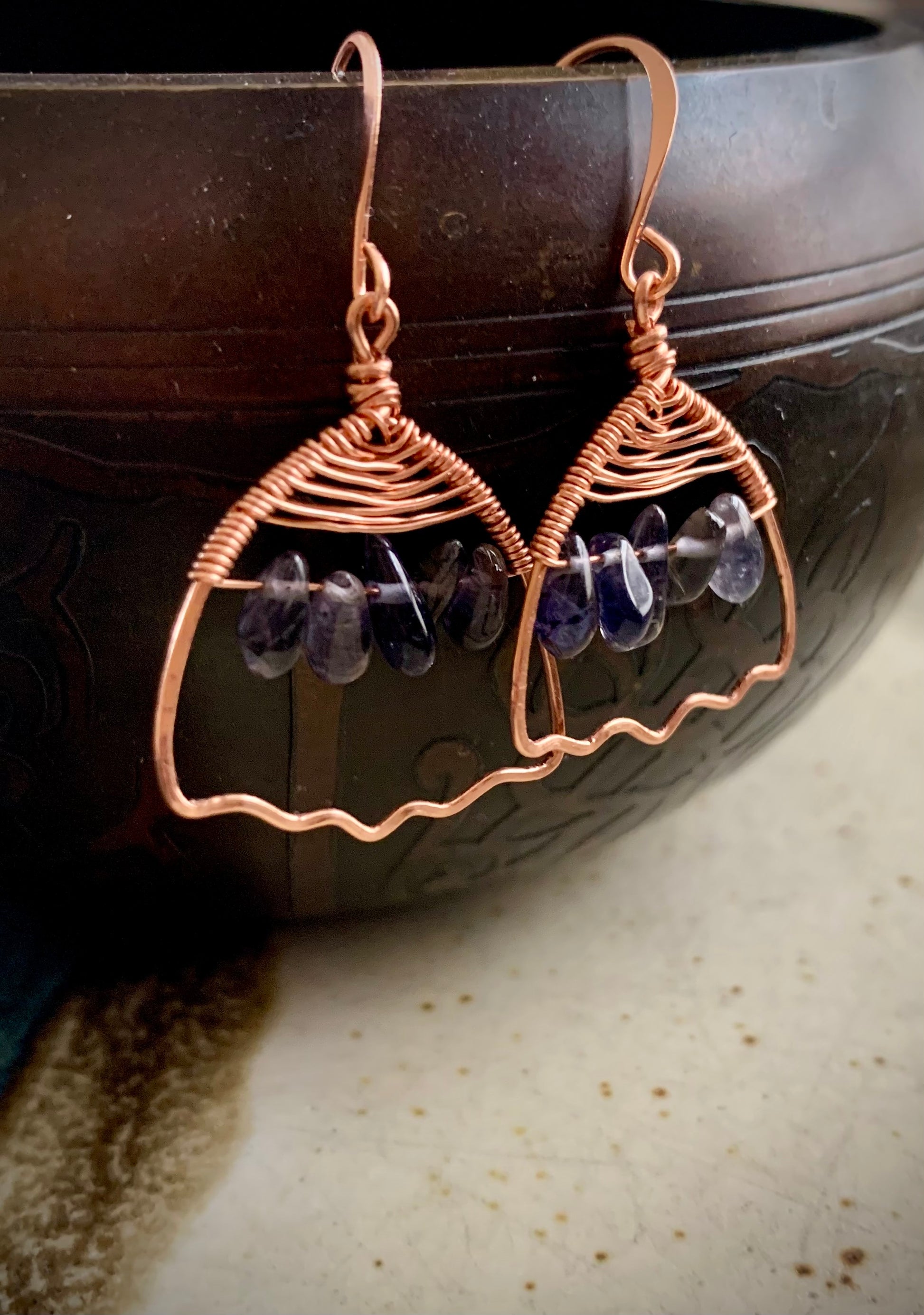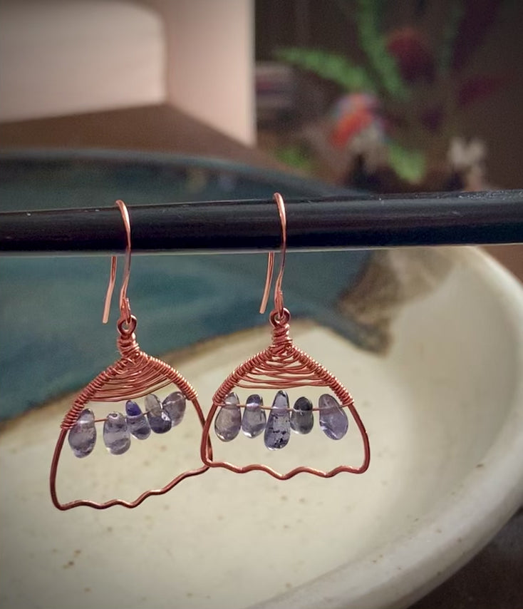 Discover our beautiful Nube Earrings, crafted with intricate copper wirework and captivating iolite gems. Elevate your look and embrace the splendor of these one-of-a-kind earrings.
