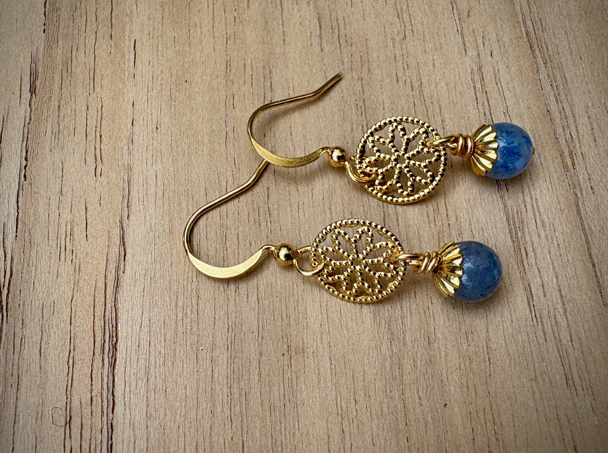 These elegant drop earrings feature soothing blue aventurine stones suspended from delicate gold-plated French hooks. A timeless choice that brings a touch of calm sophistication to any look.