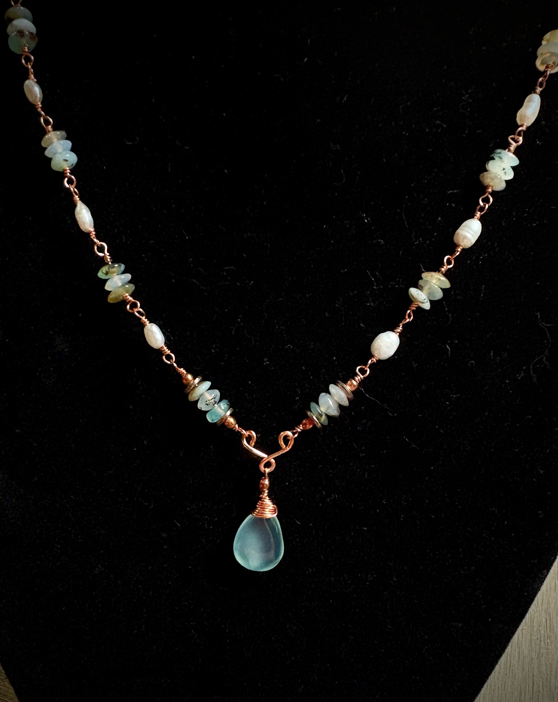 This elegant Tiara Necklace features a chalcedony pendant drop, freshwater pearls, and amazonite rondelles delicately wrapped in copper. It is secured with a copper spring clasp for a refined finish. Length is 16 inches (41 cm).
